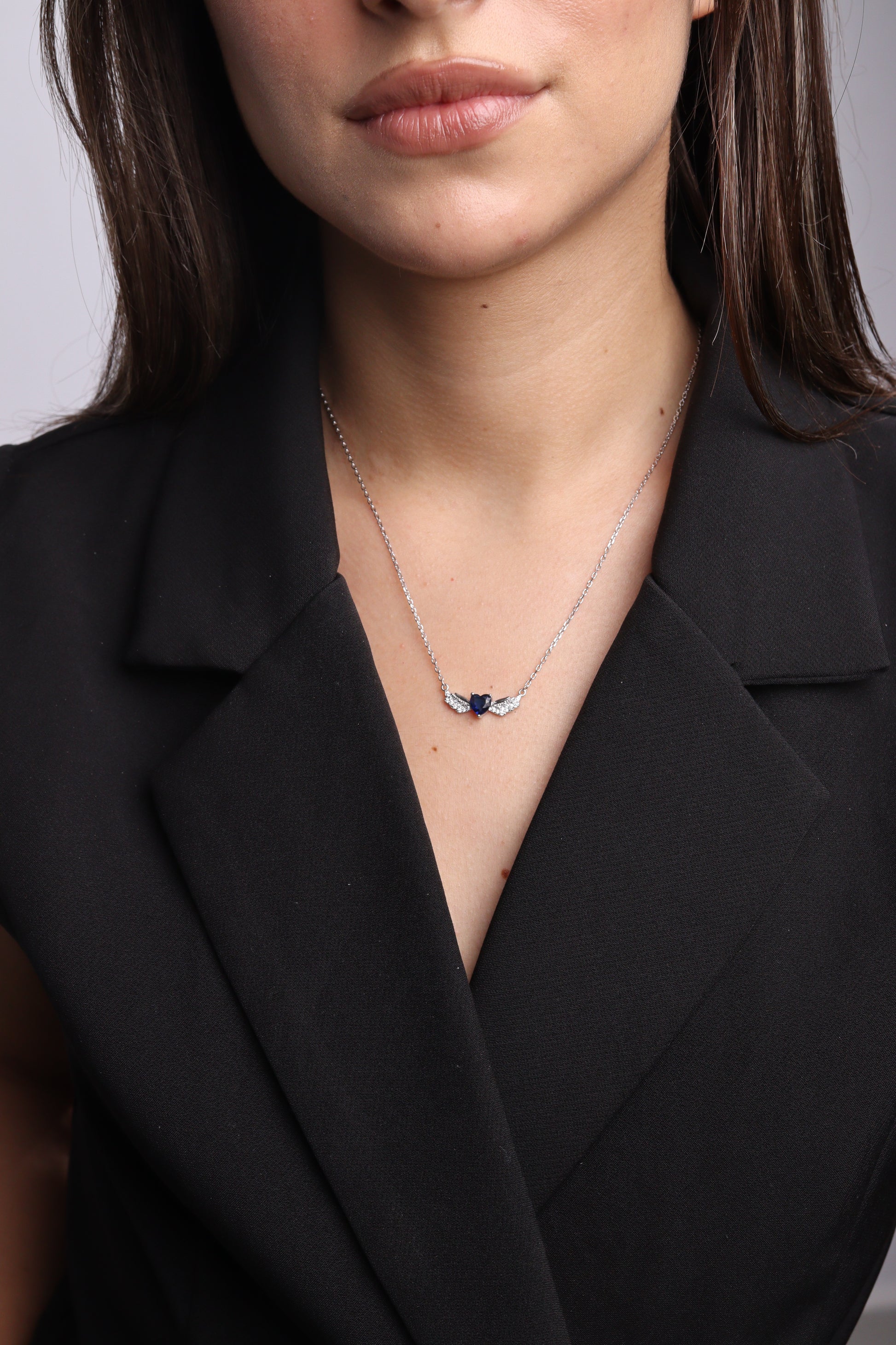 Ce collier délicat unit la profondeur envoûtante du bleu azur à la pureté des ailes argentées, symbole de liberté, de protection et d’amour sincère. Sa pierre centrale en forme de cœur capte la lumière avec intensité, révélant une brillance subtile qui sublime votre décolleté avec finesse et modernité.